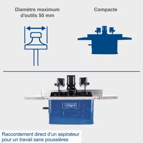 Avec une taille de table de 610 x 360 mm, la fraiseuse à bois peut également être utilisée dans de petits ateliers. Les rallonges de table intégrées des deux côtés agrandissent également la surface de la table et permettent ainsi également l’usinage de grandes pièces et l’exécution de travaux de fraisage spéciaux.